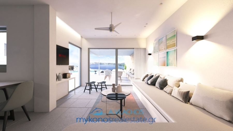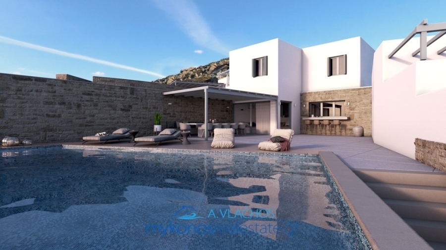 Mykonos, Diakoftis, Villa For Sale, 215 sq.m., In Plot 900 sq.m., Property Status: Amazing, Floor: Ground floor, 2 Level(s), 6 Bedrooms (6 Master), 1 Kitchen(s), 6 Bathroom(s), 1 WC, Heating: Personal - Electricity, View: Sea view, Building Year: 2023, Energy Certificate: A+, 2 parking(s), Floor type: Tiles, Type of doors: Wooden, Features: Security door, Storage room, Cable TV, Internet Line, Electric Appliances, Internal Staircase, Double Glazed Windows, Window Screens, Balconies, BBQ, Pets Allowed, No shared expenses, For Investment, Luxury, Airy, Bright, AirConditioning, Solar water system, Swimming pool, Back yard (Garden), Suitable for Commercial Use, Distance from: Airport (m): 4000, Seaside (m): 100, City (m): 3500, Price: 1.850.000€. Mykonosrealestate.gr, Tel: 2289028304, email: info@mykonosrealestate.gr