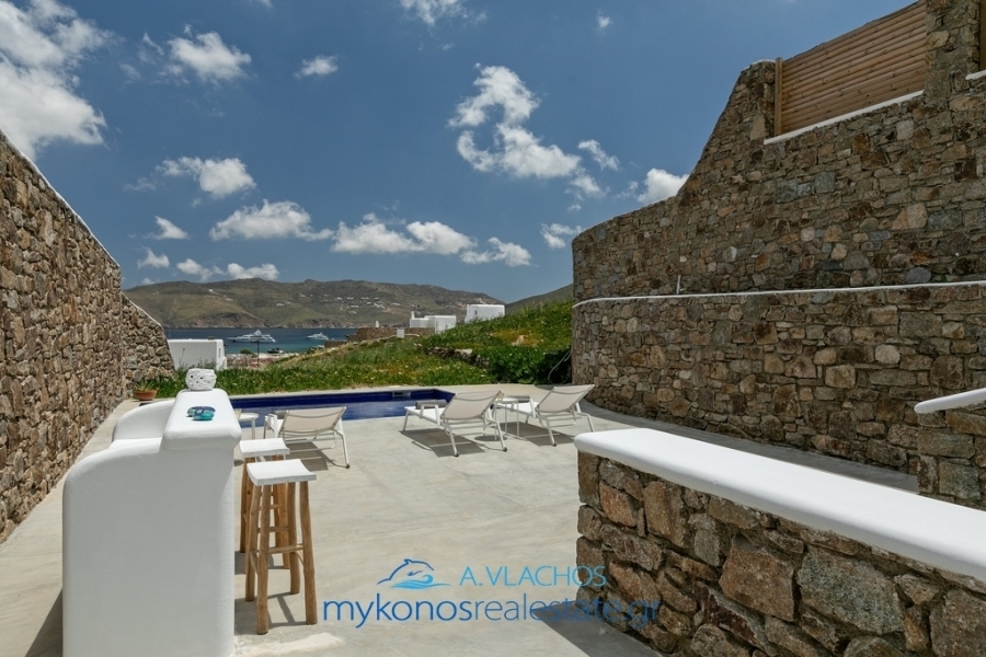 Mykonos, Panormos, Villa For Sale, 129 sq.m., In Plot 400 sq.m., Property Status: Very Good, Floor: Ground floor, 2 Level(s), 2 Bedrooms (2 Master), 1 Kitchen(s), 2 Bathroom(s), 1 WC, Heating: Personal - Electricity, View: Sea view, Building Year: 2000, Energy Certificate: B, 3 parking(s), Floor type: Tiles, Type of doors: Wooden, Features: Security door, Security alarm, Satellite Receiver, Cable TV, Internet Line, Electric Appliances, Internal Staircase, Double Glazed Windows, Window Screens, Balconies, BBQ, Pets Allowed, Water Bore, For Investment, Stonehouse, Luxury, Airy, Bright, AirConditioning, Solar water system, Boiler, Swimming pool, Back yard (Garden), Painted, Renovated, Holiday Home, Suitable for Commercial Use, Distance from: Airport (m): 7500, Seaside (m): 200, City (m): 6500, Price: 875.000€. Mykonosrealestate.gr, Tel: 2289028304, email: info@mykonosrealestate.gr